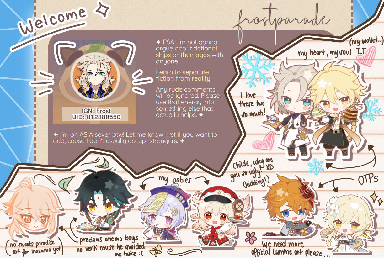 ✦ Genshin Impact - Obviously an Albedo & Aether simp. I also love Klee, Qiqi, Lumine, Xiao, Kazuha and Ayato! (In a love/hate relationship with Childe because of artifact & weapon pains lol)